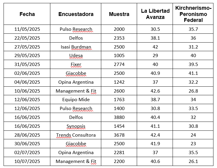 Para darle forma a este análisis, partimos de 16 encuestas realizadas entre mayo y julio de 2025, cada una con distintos tamaños de muestra y fuentes variadas. En lugar de quedarnos con los números tal cual, se aplicó un modelo estadístico que toma esos datos dispersos y les busca un patrón en el tiempo, proyectando las tendencias hacia una fecha clave (03 de agosto de 2025).
