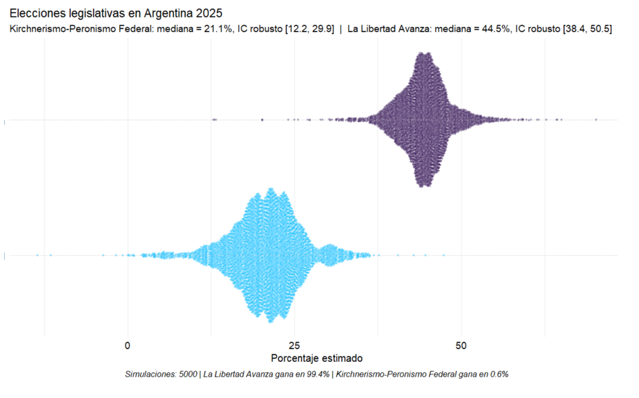 La diferencia no solo se expresa en cifras, sino en probabilidades: La Libertad Avanza vence en el 99.4% de las simulaciones, mientras que el Kirchnerismo–Peronismo Federal lo hace apenas en el 0.6%.